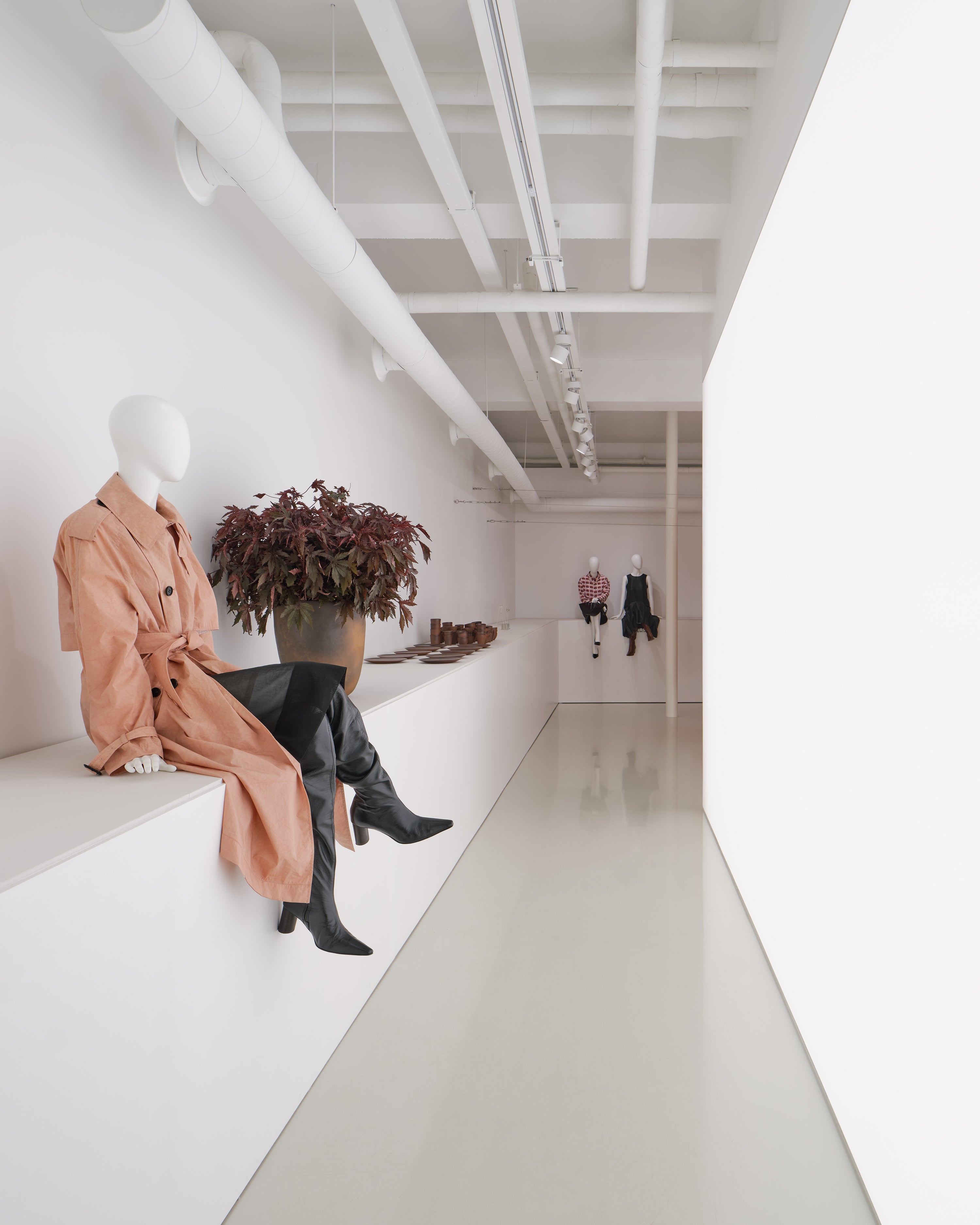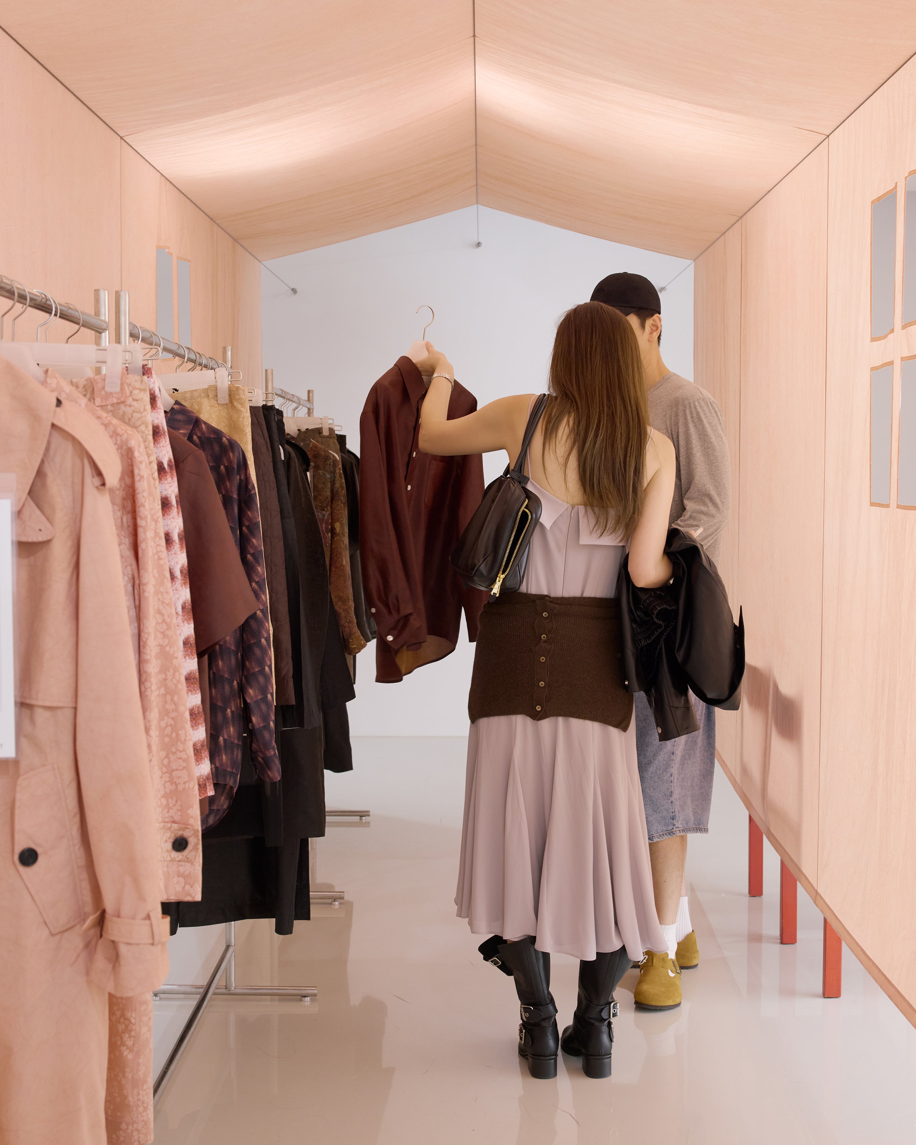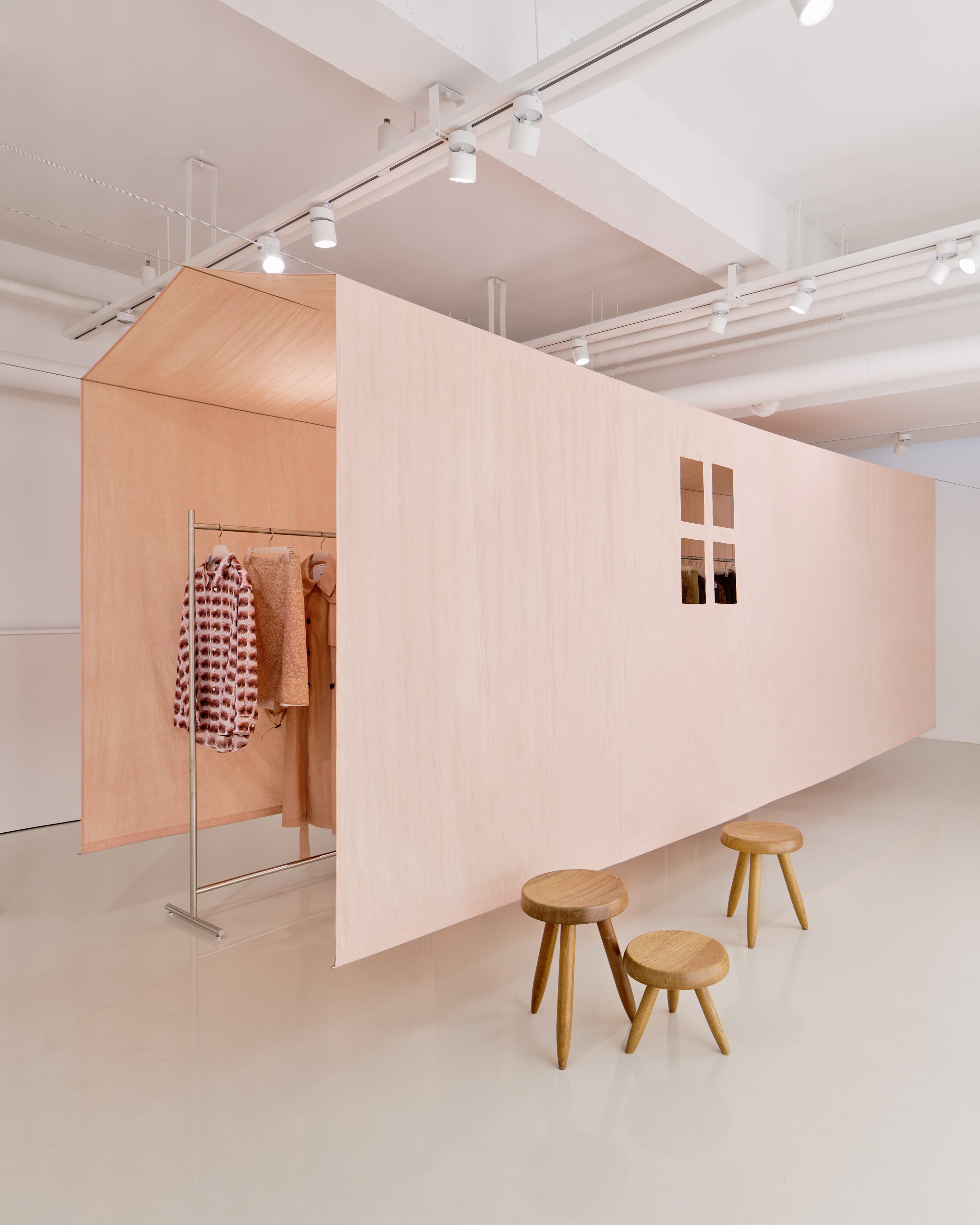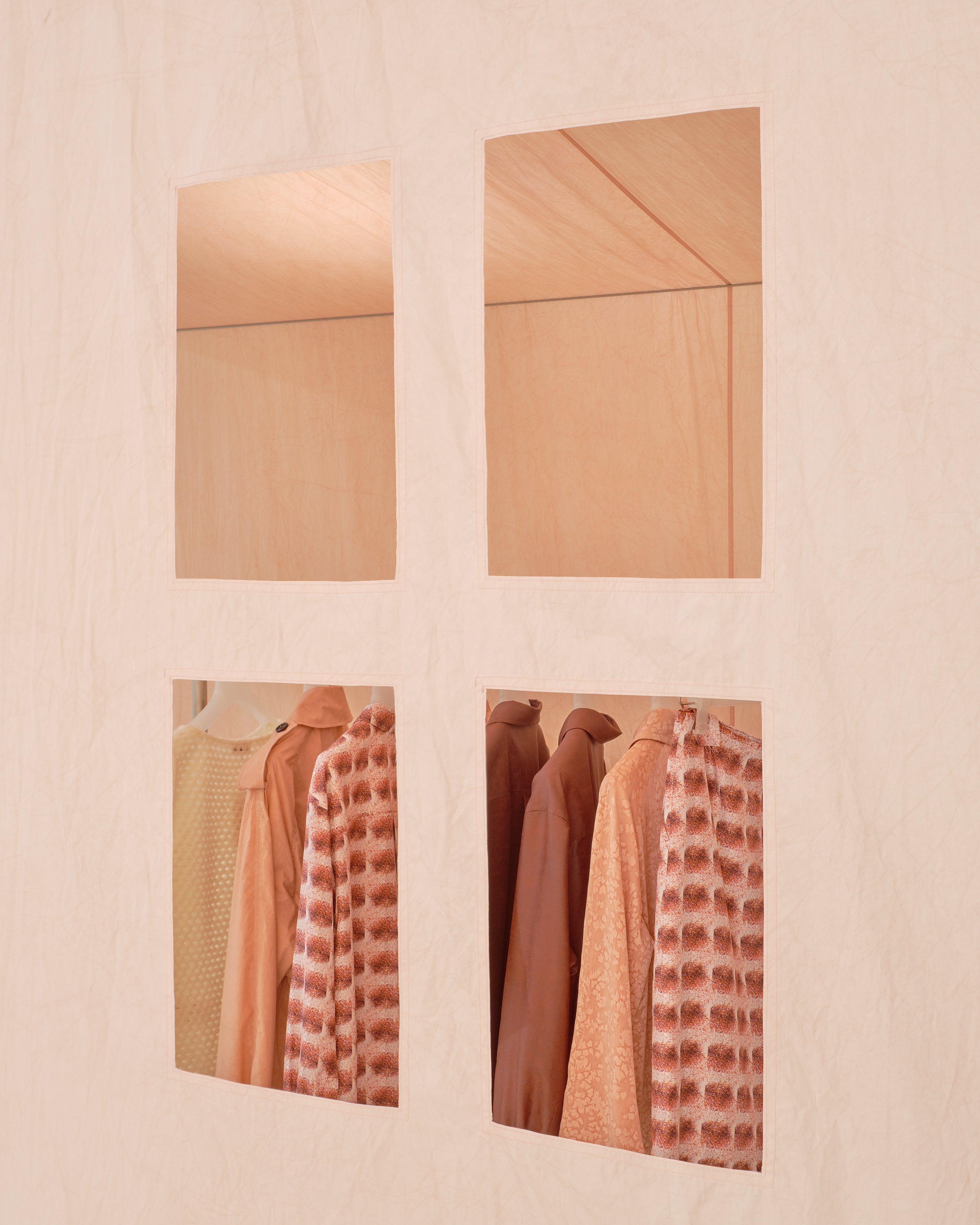 <A conversation in color> begins with an installation that takes the form of a house, constructed from fabric dyed in soft shades of pink. This project extends the brand’s signature brown tones, proposing a new visual language through the gentle spectrum of pink. The tent fabric was hand-crafted at a workshop in Cheongdo, using natural dyeing techniques with wood. Its subtle texture and warm hue embody the sense of time and intimacy that UMBER seeks to convey. Inside the house, UMBER POSTPAST’s 2025 F/W collection is presented, inviting visitors to see, wear, and experience the garments directly. This season explores diverse dyeing methods—including resist dyeing and the textures of clay—revealing a new elegance born from the interplay of weave, color, and material. <A conversation in color> moves beyond a simple installation to show how color can expand within space and be experienced through clothing, further developing the visual language that defines UMBER POSTPAST.