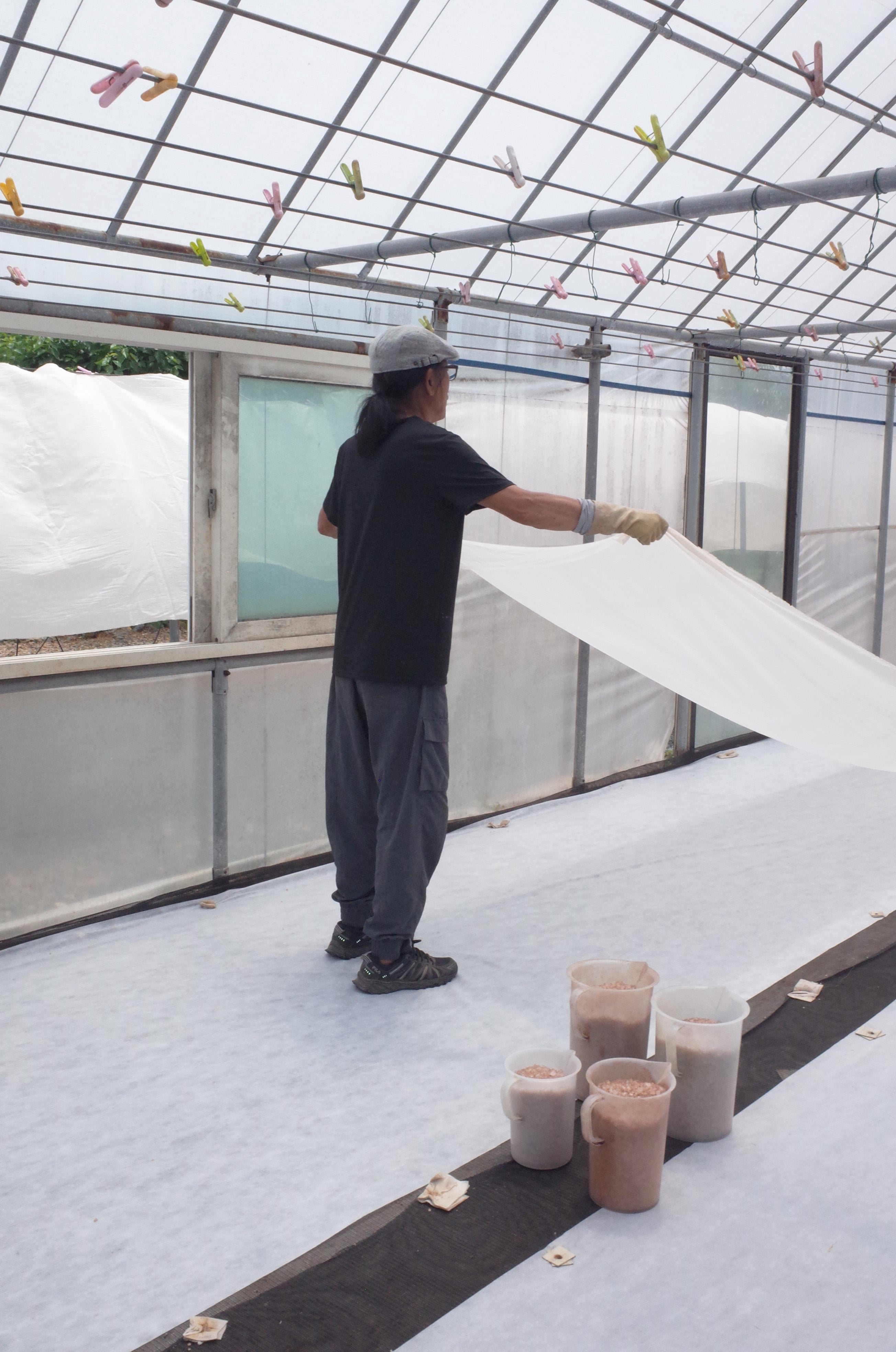 JC: You know when you’re in elementary and middle school, you come home tired and lie down on the couch? When the sunlight came in, I would look at the warp and weft of the cushion in the light. I’d notice that the flower pattern on the left repeated itself in three stages, starting from the bottom. Or, when eating dinner, I’d look at the curtains and think, “There’s the A theme flower, then the B theme in the middle, and the A theme comes back; if one of the B theme flowers were replaced with another flower, it would be more beautiful.” I grew up thinking about these things, making observations. JKO: Even when we drip in sweat, natural dyeing has its charms. On a nice day, when the birds are chirping and singing, and the mountains and fields are turning reddish, the breeze rustling through them, it brings peace to my heart. How cozy and pleasant it is. It’s wonderful and heavenly. I feel peace. KDG: When people get into natural dyeing, they become pure. They have no desire to harm others, their minds free of thoughts. They are simply at ease. They go with the flow, gently. JKO: It’s got nothing to do with money; it’s far from money. It feels like I'm part of nature... Yesterday is like today, and today is like tomorrow. It’s just a feeling of blending in. It's truly peaceful. And it’s enjoyable to look at. When I’d step out to the store for a bit and come back, the colors would have changed. The reddish hues become deeper, different. It brings joy, and I feel a sense of pride. The difficult part is that natural dyeing isn’t something humans do; it’s something nature does. So we can’t do it during the rainy season or when it’s cloudy. No matter how urgent it is, we can’t do it if there isn’t enough sunlight. KDG: It’s up to nature, not us. JKO: Yes, no matter how much we want, there’s nothing we can do about it. It’s beyond our means. KDG: These days, brands are aware of this situation when they place an order… Because the sunlight is different in spring and summer, the colors and tones are going to be different. Salt dyeing is something we’re testing for the first time; we’ll soon figure it out.