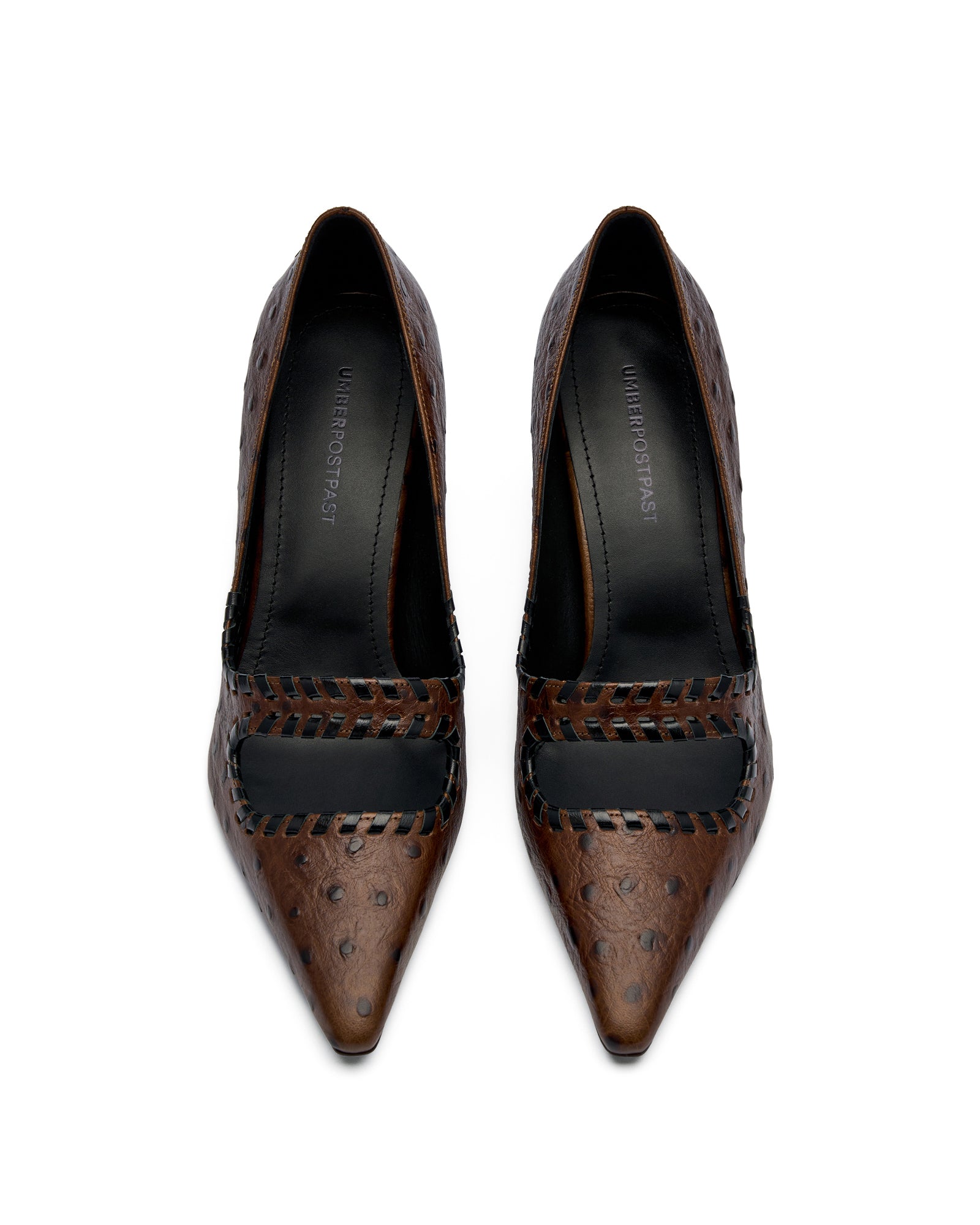 - 베지터블 태닝 타조 엠보 소가죽 미들 힐