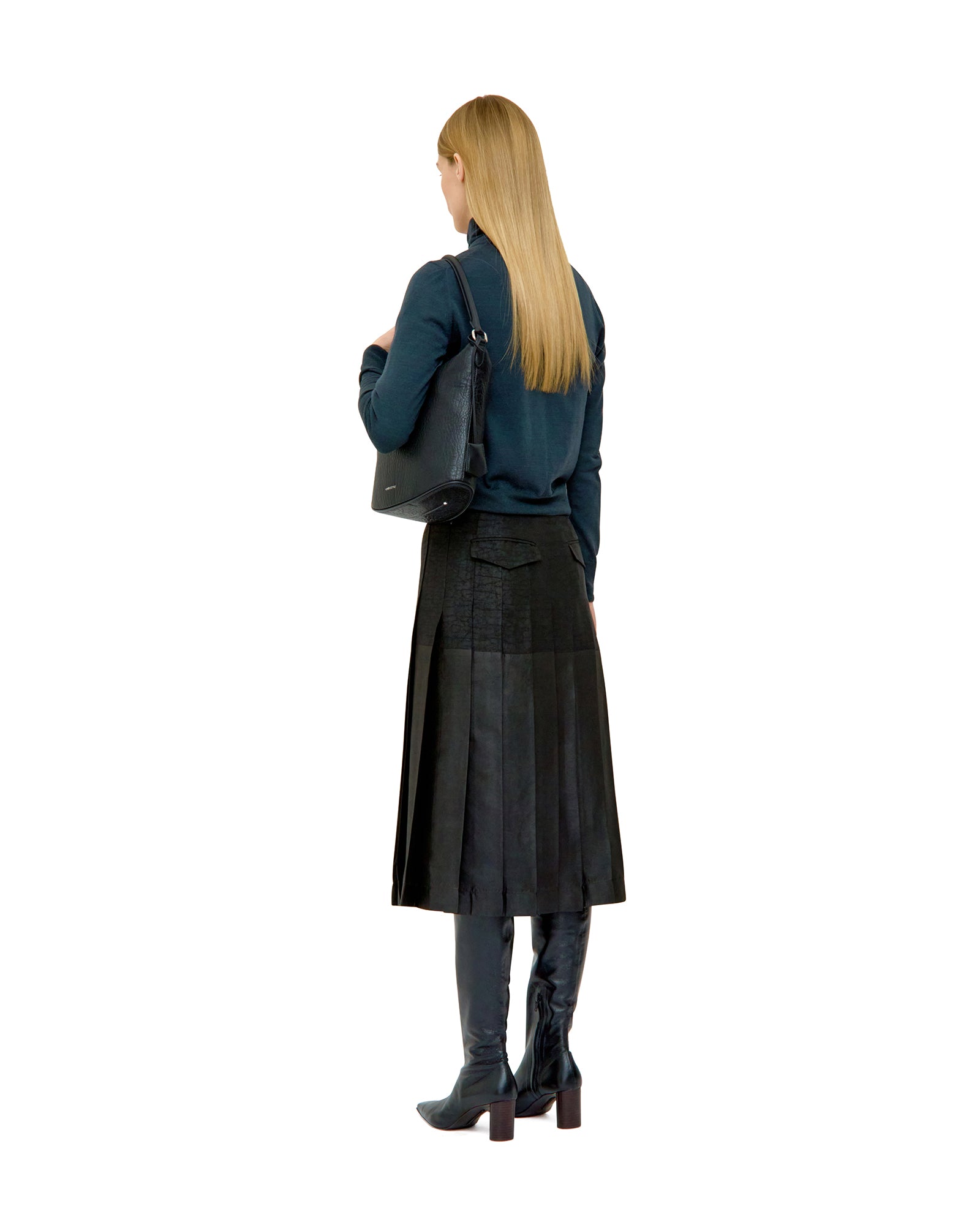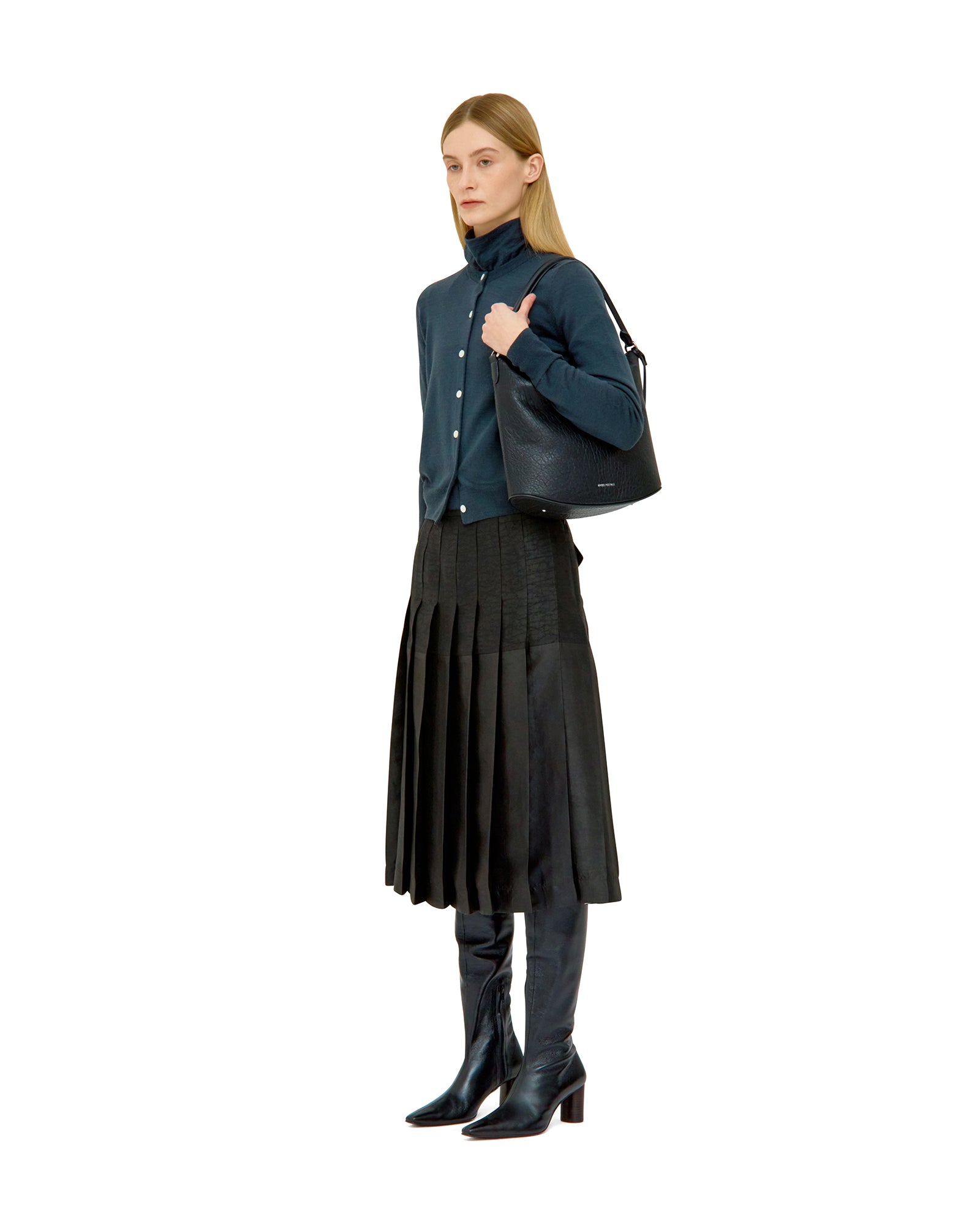 UMBER’s mud-dyeing fabric uses silk dyed with Shu-liang. The fabric is completed by repeatedly applying mud and drying it with sunlight. The fabric’s luxurious black color is implemented only after several repeated drying and more than six months of preservation. The fabric, which utilizes mud dyeing techniques, has a distinctive gloss and refined color, as well as antibacterial/insective effects and UV blocking.